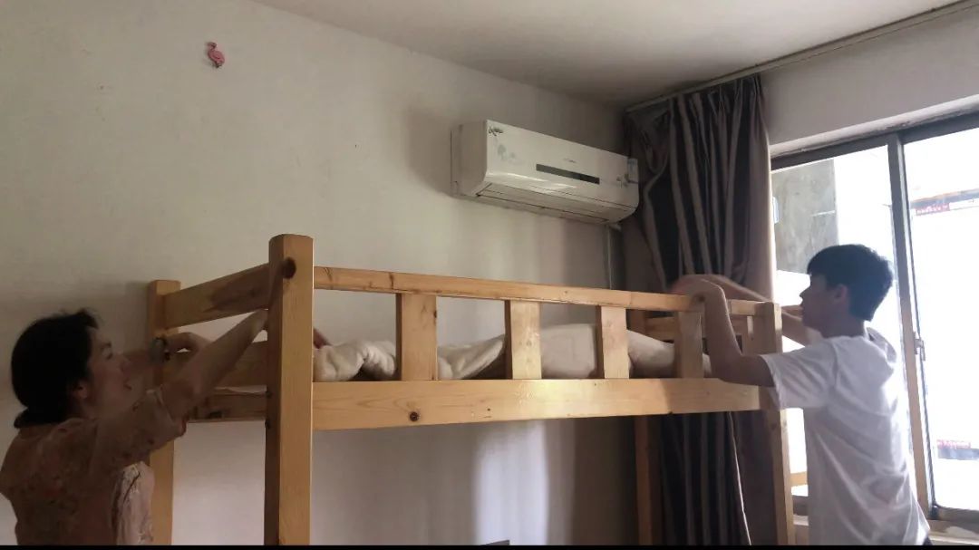領(lǐng)取好各自的床上用品后,新生們由老師帶至各自的寢室,在父母的幫襯下,開始布置寢室。